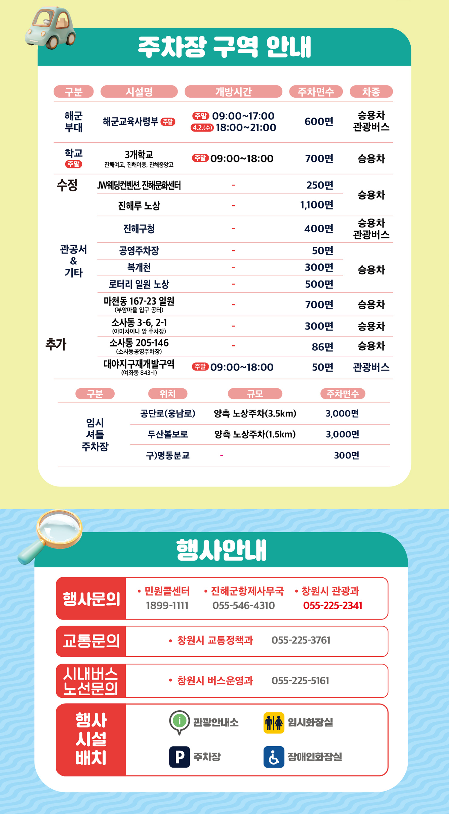 - 자가용 이용 시: 공영주차장 및 임시 주차장 다수 운영 예정 (축제 홈페이지 참조)