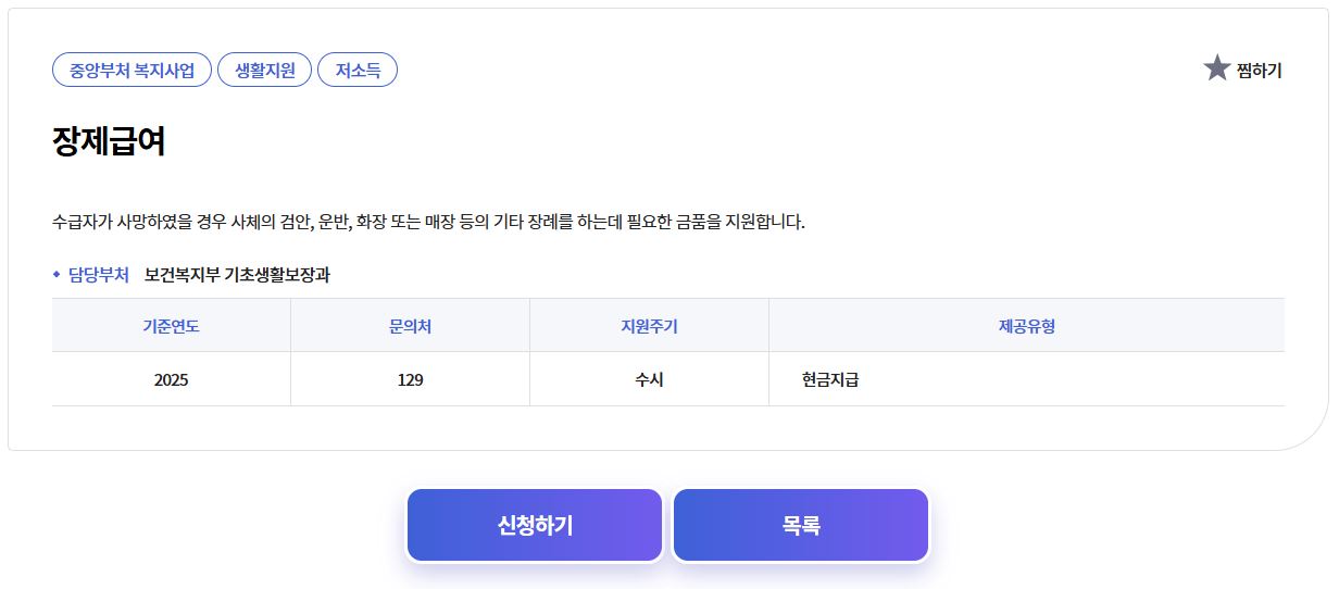 - 복지로(www.bokjiro.go.kr) → [서비스 찾기] → ‘장제급여’ 검색 → 신청